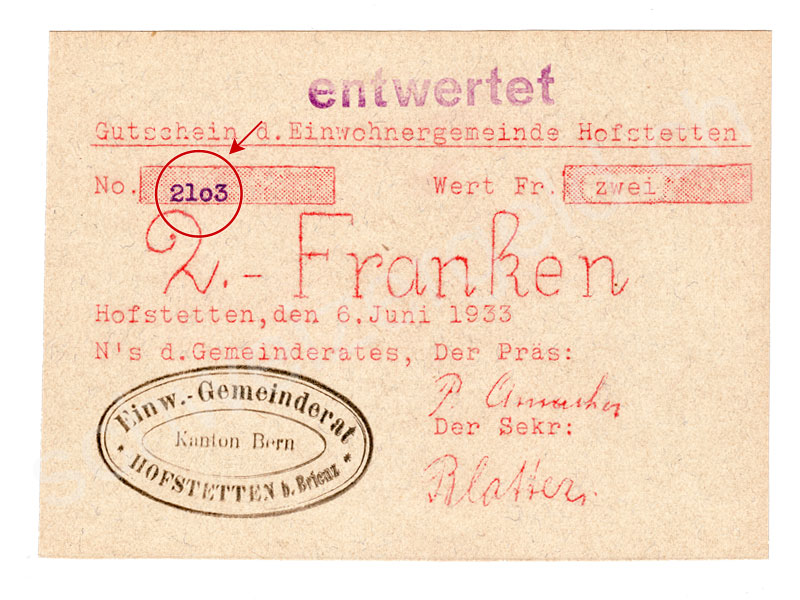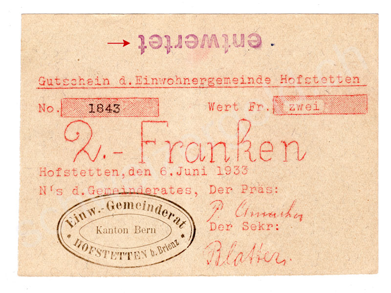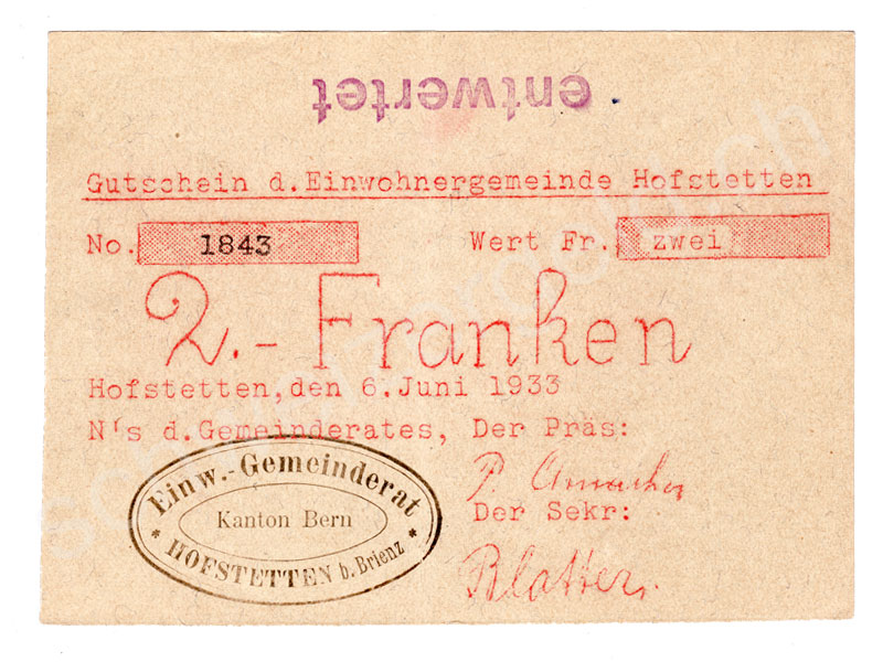 Billets de banque: Argent de nécessité Hofstetten, 2 francs